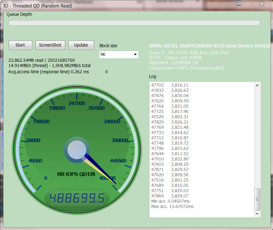 This is what we hoped to attain from Crystal Diskmark. Granted, the 4K random write performance is a bit lower, but the sequential read and write results on the left are definitely highlighted by the access time and Total Score. Prior to this test, nobody could have ever convinced me that we could pull 400K IOPS from a single PCB/single controller SSD design.