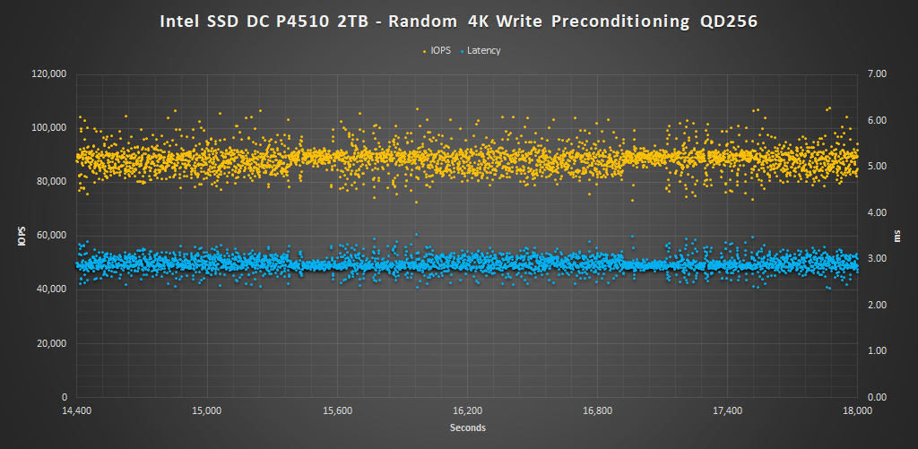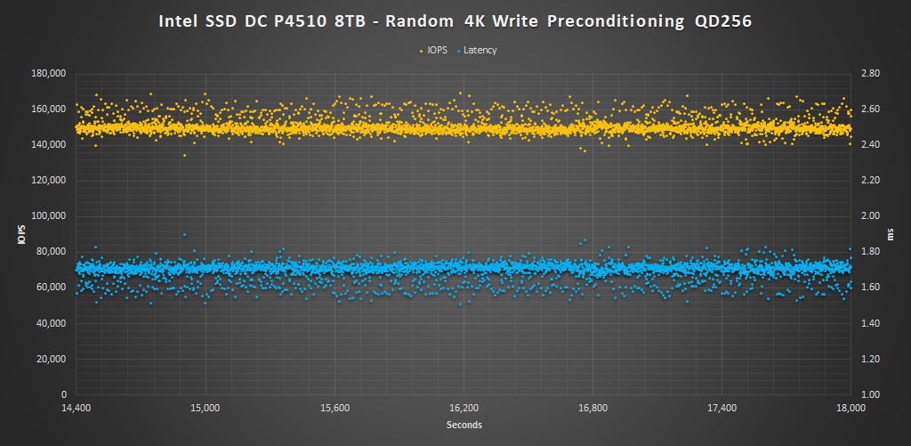 During preconditioning, we can see that for the most part, the Intel DC P4510 series delivers exactly the performance as promised per capacity point. There is some variability in their plots, however, most results are above the rated spec and few are below.