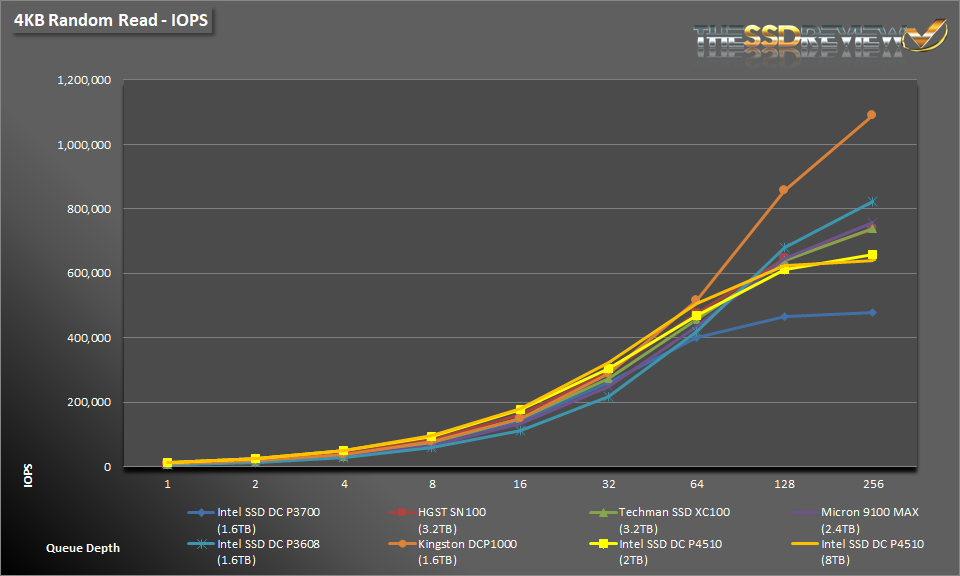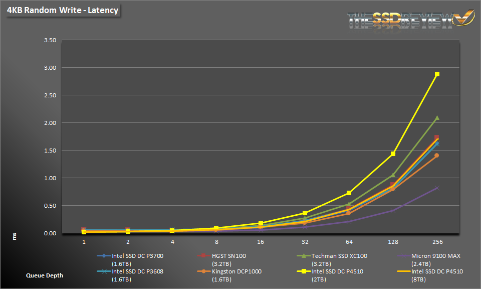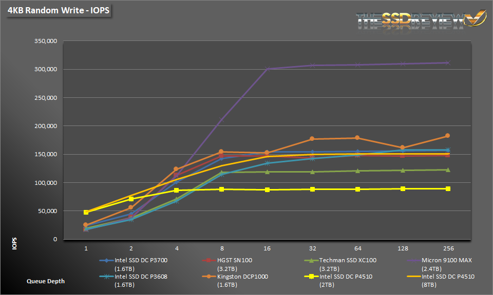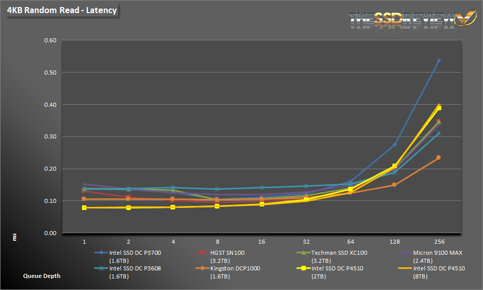 During 4K reads the DC P4510, in both capacities, demonstrate strong read performance from QD1-64, beating out most of the competition. It isn’t until QD 64 that other drives catch up to them.