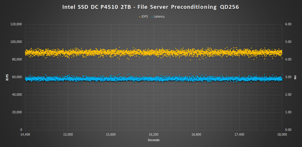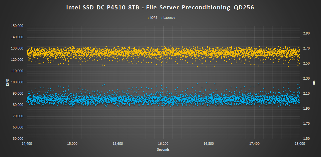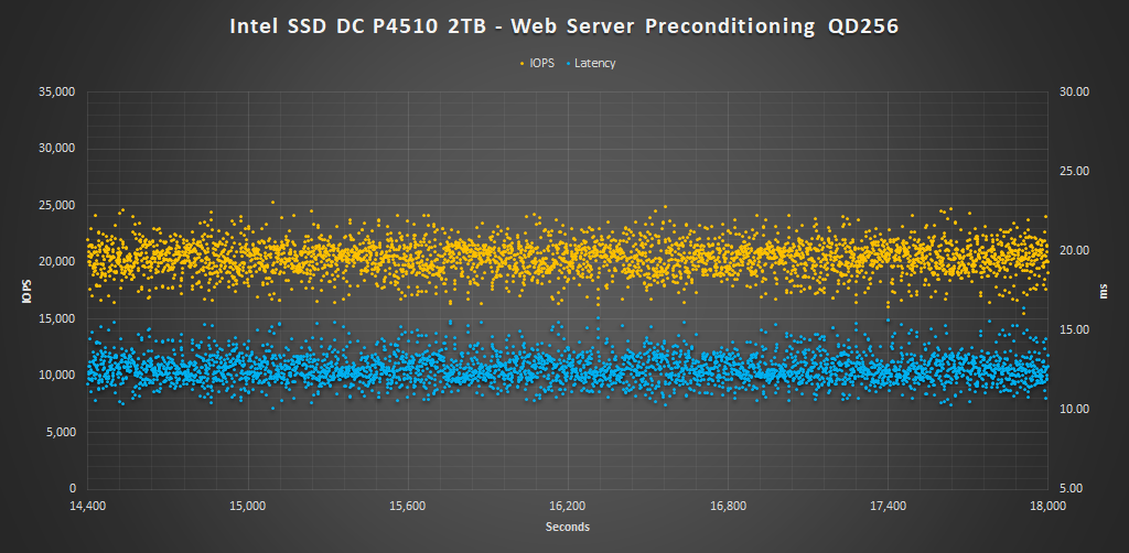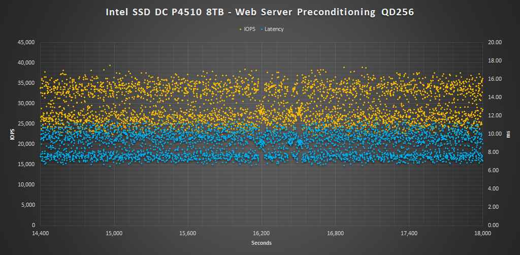 Our last set of profiles include both File Server and Web Server workloads. As mentioned before the last hour of preconditioning, the average IOPS, and average latency for each QD is graphed below.