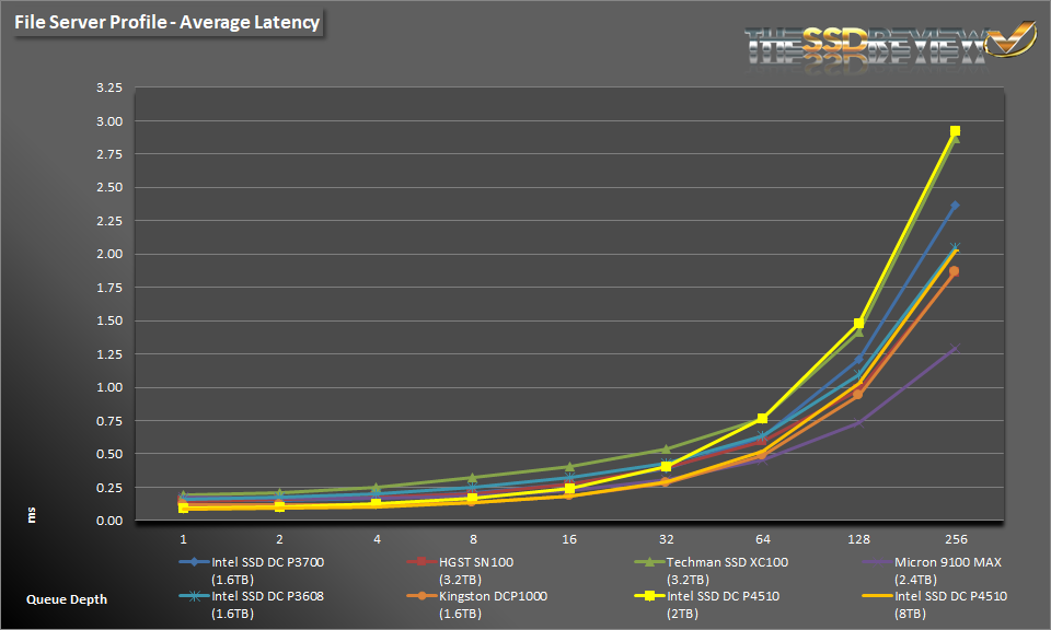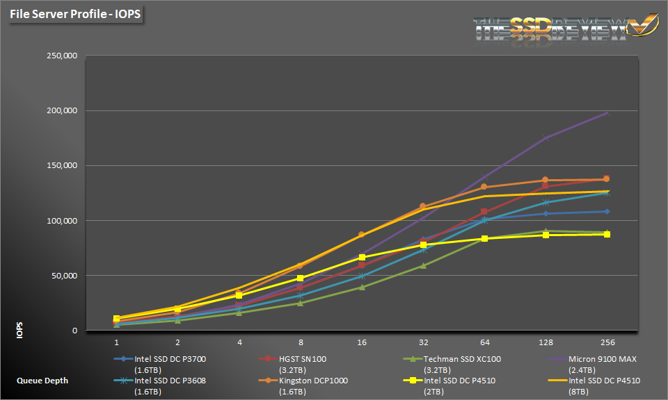 In the file server profile test, we see similar results to what we have seen in the previous server tests. The 8TB model delivers performance that is close to the Kingston DC P1000 and the 2TB model still shows its strength in the lower and mid QD range.