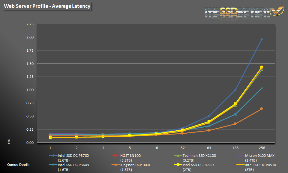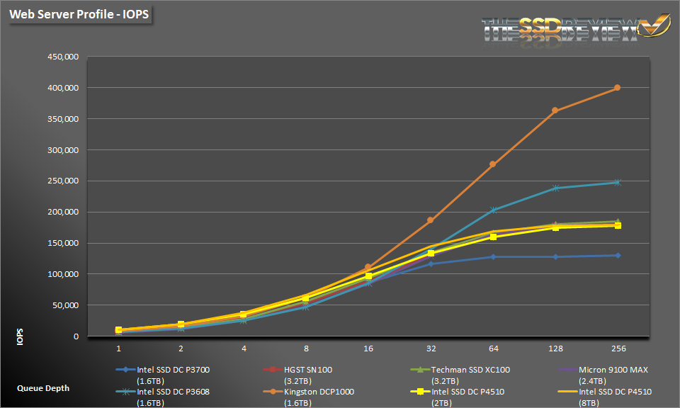 Finally, during the web server profile, we see that the Intel DC P4510 is about on par with the SN100, XC100, and even the Micron 9100 MAX. Intel’s DC P3608 and Kingston’s DCP1000 are the only two that beat it.