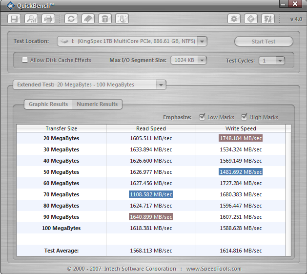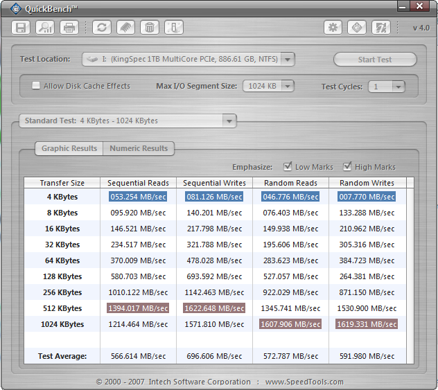We wanted to replicate what we had seen in ATTO and felt that QuickBench was just the program to do that. Just as ATTO does, QuickBench measures transfer speeds of files of different sizes. Our main purpose for this test was to confirm or deny what ATTO had shown, and that was that the KingSpec PCIe SSD prefers large file transfers more so than small.