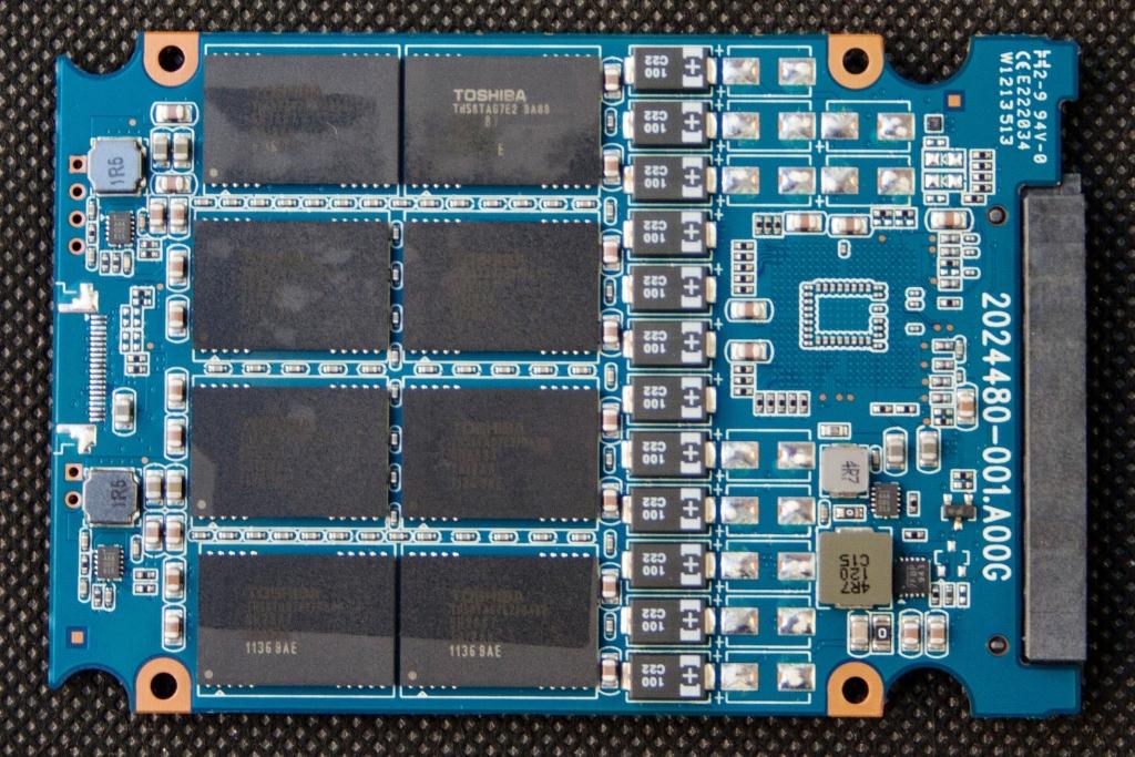 Our 200GB model has 256GB of Toshiba eMLC onboard. 128GB of that is placed on the front alongside the SandForce 2582 flash storage processor. The remaining 128GB and power loss protection system are found on the opposite side. After sacrificing one die worth of capacity to R.A.I.S.E., other SandForce needs, and some additional overprovisioning (28% officially), 186Gb remains for user storage.