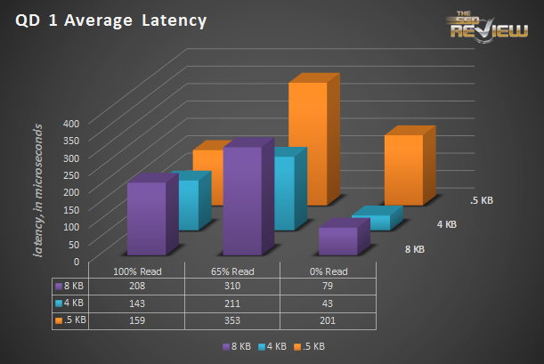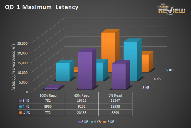 Out of all the input/outputs accrued over the testing period, the transactions with the highest latency are shown here. In a worse case scenario, QD 1 maximum latency can reach almost 20,000 microseconds, or 20ms for 8K 65% reads. Mixed workloads usually generate the worst maximum latency anyway, but exclusive reads almost always have the best.