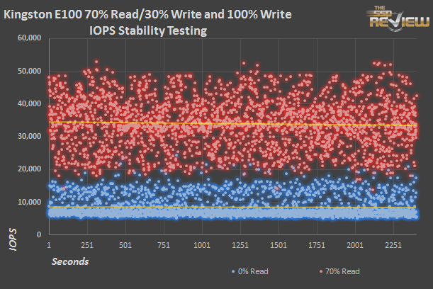 If you refer to the write saturation test above, you’ll notice that the run with incompressible data bottoms out around the 9,000 IOP mark. Now, look at the stability chart for the 0% Read (100% write) test denoted by blue neon markers. The average is about the same, but looking at the test in finer increments shows much more variance. On a second by second basis, the results can be as low as 6,000 IOPS or as high as 20,000. The 70%/30% split shows even more variance from one moment to the next. Less variance is preferable to more variance, meaning tighter groups are better. We won’t bore you with the statistical analysis, since your eyes will tell you everything you need to know.