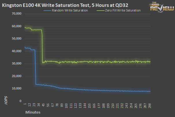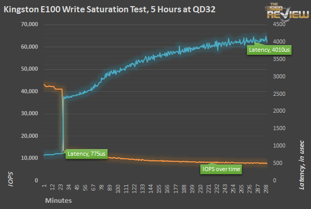 Because of the nature of solid state storage, once the drive gets filled, write speed takes a precipitous plunge. We can take a fresh drive and write 4K randoms to it for 300 minutes to see what happens.