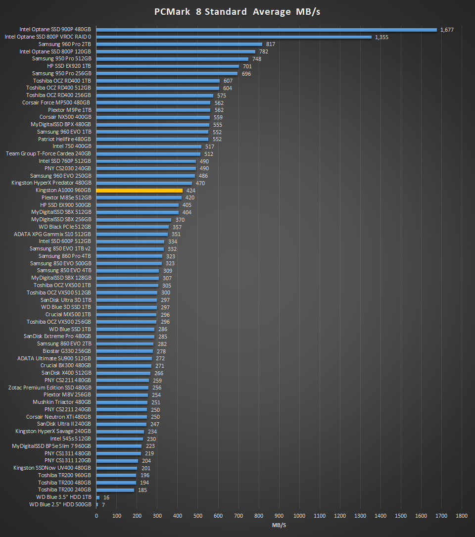 This test is not meant for an entry-level consumer NVMe SSD. In fact, there has been more than a few drives that have not completed the 18 plus hours of testing that PCMark 8 Extended puts out there. That alone is much a compliment for the Kingston A1000 NVMe M.2 entry level SSD.