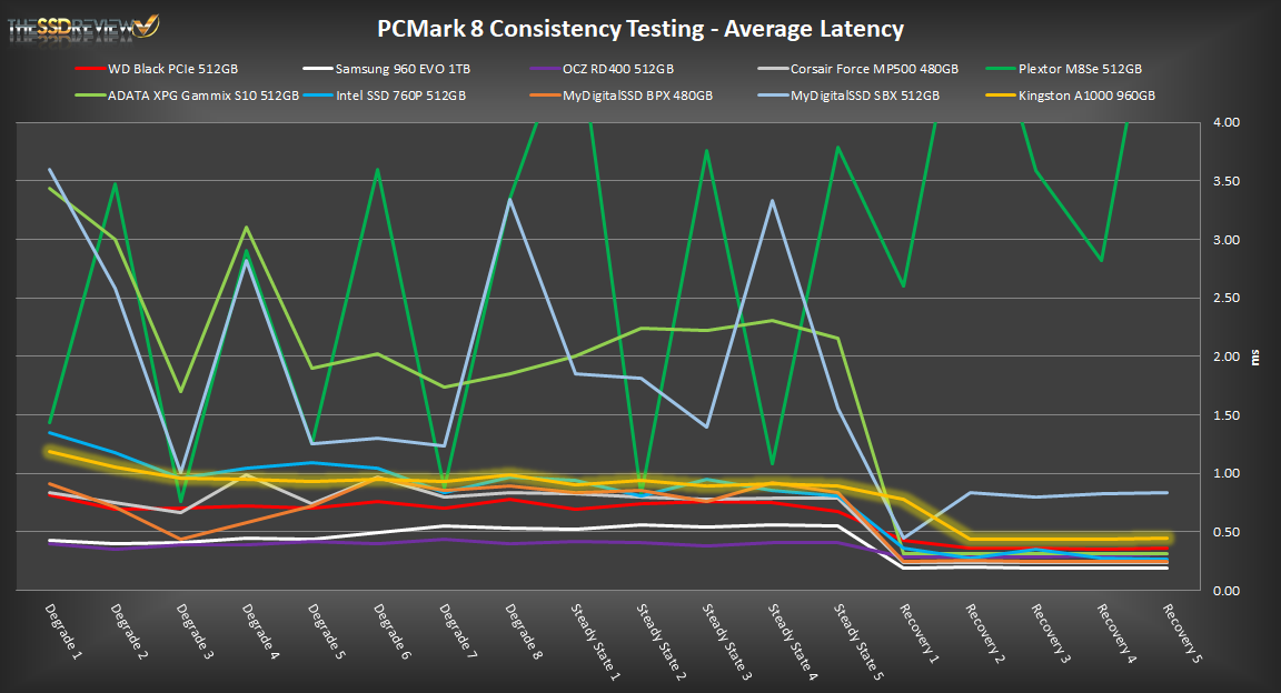 In reading the results, the Degrade and Steady State phases represent heavy workload testing while the recovery phase represents typical consumer light workload testing.