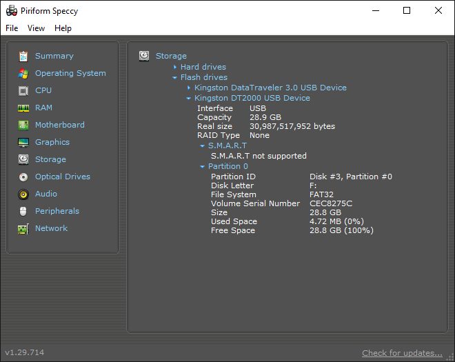 Speccy shows us that the Kingston DT2000 has a raw capacity of 30.9 GB, is formatted in FAT32 and has a total usable space of 28.8 GB.