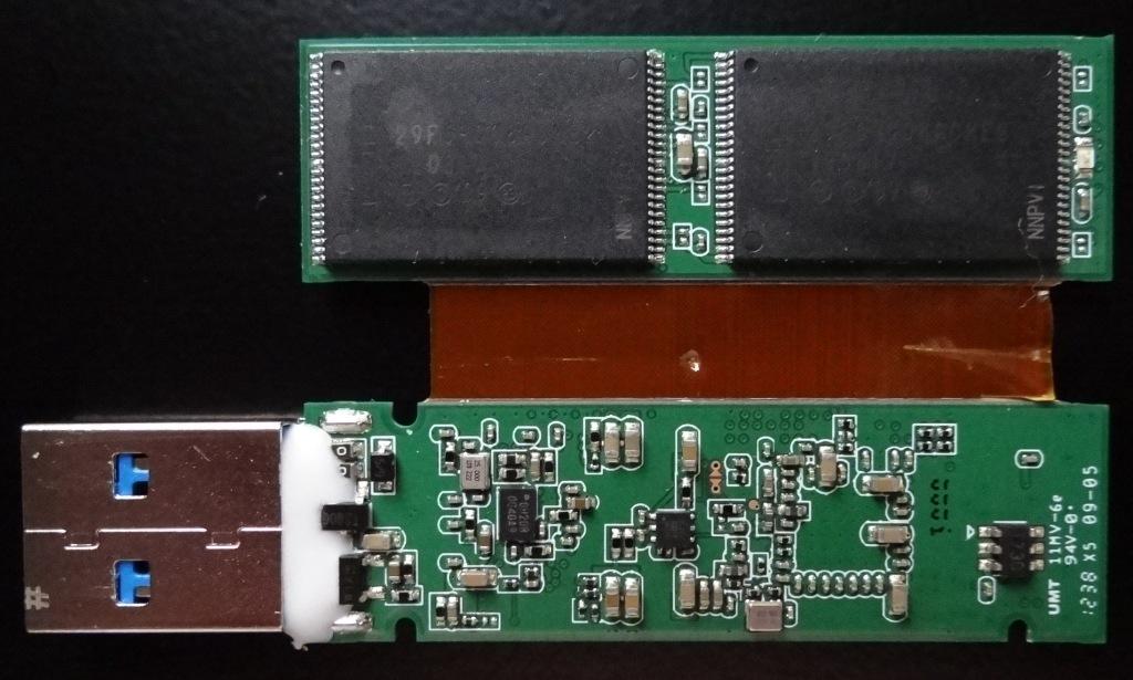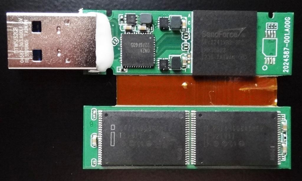 If we might offer a bit of advise, DO NOT attempt to follow our lead on this one as our Workspace perished as a result of disassembly. Once opened, the Workspace contains two attached printed circuit boards, the main one containing the Genesys USB 3 SATA Bridge and LSI SandForce SF-2241 flash storage processor with each containing two modules of Intel 25nm MLC synchronous 8GB NAND flash memory. The RAW total of all memory is 32GB, however, the use of over provisioning reduces it slightly to 29GB.