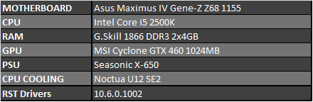 Testing will be performed on an Asus Maximus IV Gene-Z paired with an Intel Core i5 2500K and 8GB of G.Skill DD3 1866.