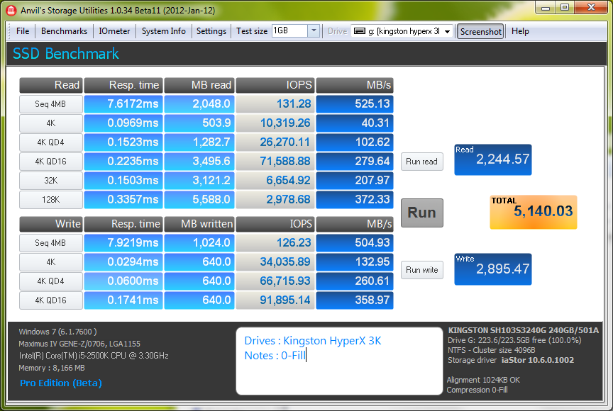 Anvil Storage Utilities has a vast array of options, including multiple compression levels, and multi-threaded read and write tests. The 3K’s zero-fill scores in Anvil are excellent as well, showing extremely high random performance, much higher than CrystalDiskMark and AS-SSD. Those two benches use random data by default, but the cause for such higher scores is generally found in the way the bench tests a given parameter.