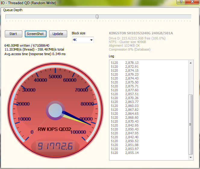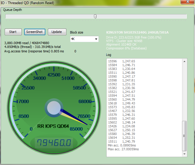 Anvil’s read/write IOPS testing was performed. The HyperX pulled down much higher max IOPS than rated by Kingston, though they test with IOmeter. ASU is very similar, and the data here is very easily compressible, but the results are still impressive at 79,460 read IOPS and 91,772 write IOPS as compared to the rated 86,000 read and 60,000 write max IOPS. The difference is likely the compressibility of the data and the testing method but it is still nice to see.