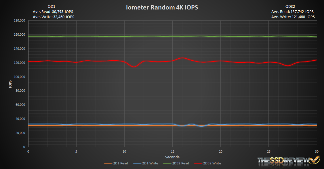 In Iometer we ran a 4KB random workload at QD1 and QD32 for 30 seconds, these are the results. We were able to achieve an average of nearly 158K IOPS read and over 121K IOPS write. This is even better than what the rated specs list, thus we have to say that the HyperX Predator M.2 PCIe SSD has done a very good job here.