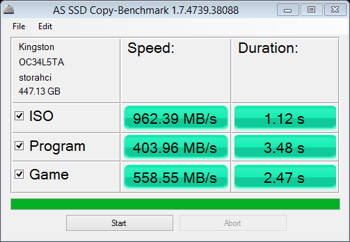 To complement this, the AS SSD Copy Bench presents us with transfer speeds for different file types. It reached a high of 962MB/s for the ISO test. For its lowest value, it reached 404MB/s on the program test.