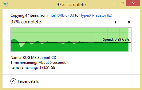 I had a three SSD RAID 0 array on the motherboard SATA controller that I was transferring files to and from the HyperX Predator M.2 SSD. I put the M.2 stick itself into the onboard M.2 socket rather than using the HHHL card as well to test temps in real world use cases and it was fine in terms of heat.
