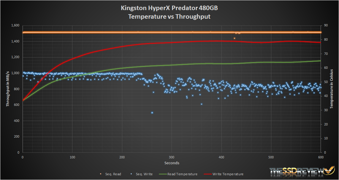 During our normal testing, the controller’s temperature stayed within its operation range and didn’t reach a throttling point, it was below 65C. During this test however we can see some much higher heat output. We can see that during pure reading the controller maxes out at around 65C as we seen with our other tests, however during writes the controller’s heat increased to a max of 79C at around the 6 minute mark.