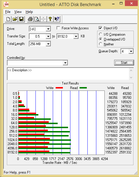 ATTO Disk Benchmark is perhaps one of the oldest benchmarks going and is definitely the main staple for manufacturer performance specifications. ATTO uses RAW or compressible data and, for our benchmarks, we use a set length of 256mb and test both the read and write performance of various transfer sizes ranging from 0.5 to 8192kb. Manufacturers prefer this method of testing as it deals with raw (compressible) data rather than random (includes incompressible data) which, although more realistic, results in lower performance results.