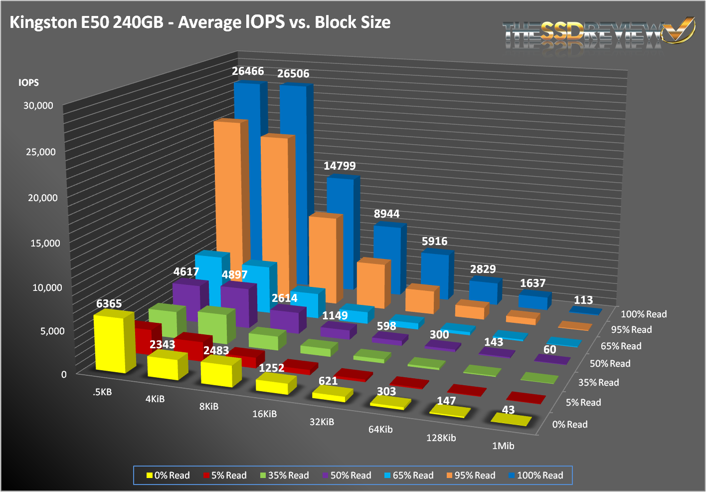 Our SNIA testing just reinforces our previous results. With repeating data (bottom), the E50 performs great on write operations, but trails in read performance. With random data (top), the E50 trails, and in most cases, it’s not close.