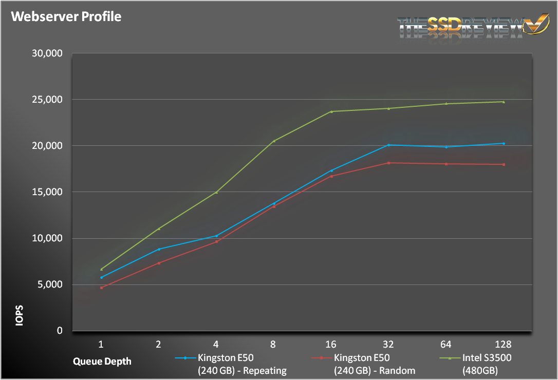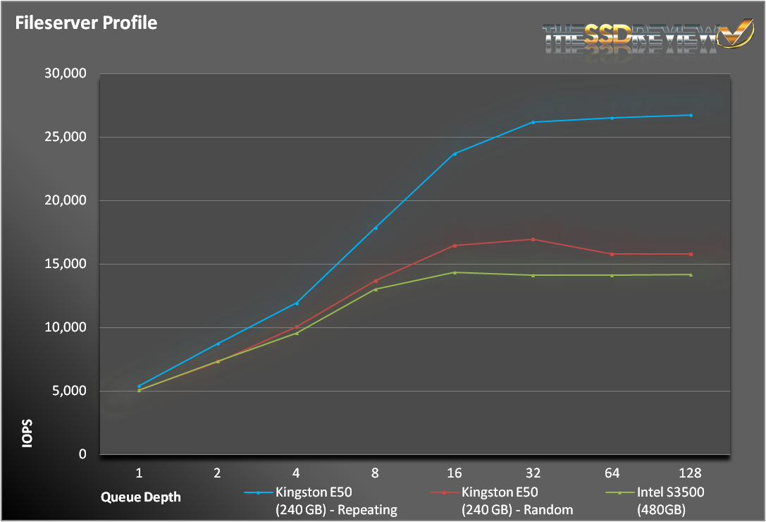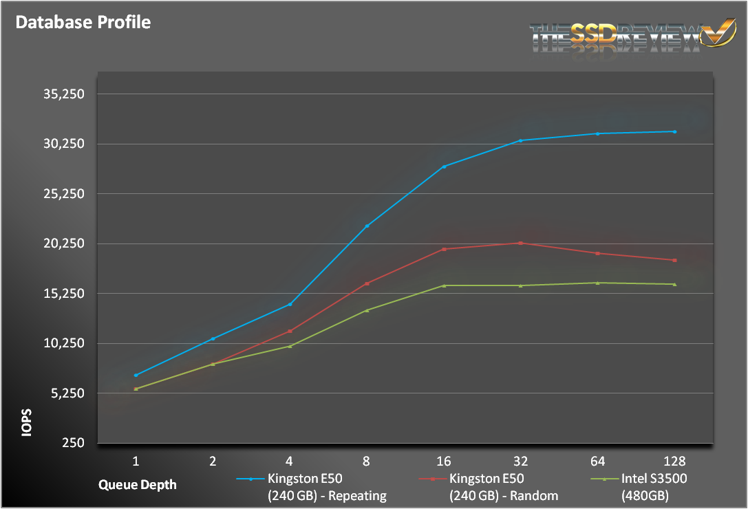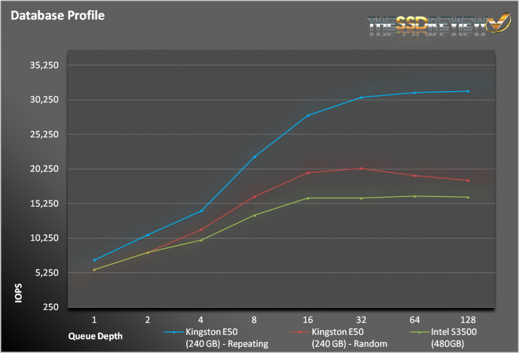With most of our tests complete, it would be pretty easy to guess how our server profile tests would go. This is the reason we perform the tests. Not only did the E50 come out on top for repeating data, it pulled out a win at all queue depths for random data. We were a little shocked when we saw the results. Up to this point, the S3500 was the clear winner on all read tests and all random write tests. Considering our server profiles more closely match real-world performance, it is a good sign for the Kingston drive.