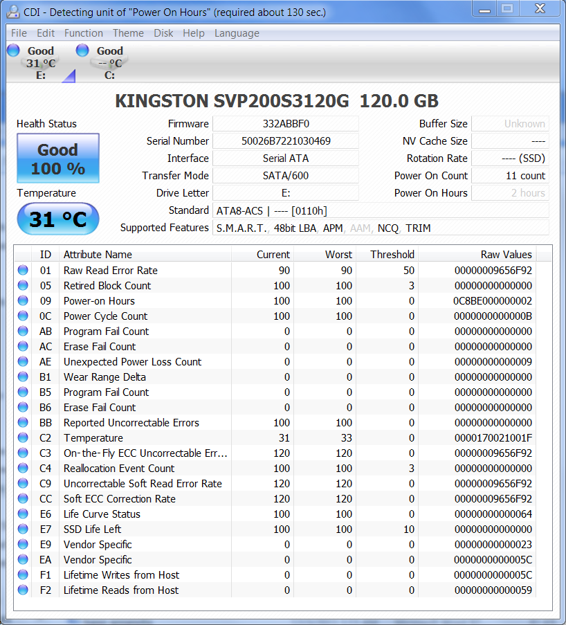 Crystal Disk Info provides some excellent information about the SSD itself to include its health, product information, power on information as well as the characteristics of the SSD. We can see that the SSD is capable of TRIM as it is not greyed out as with AAM.