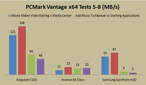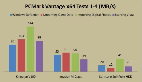 As the Kingston SSDNow V100 series of solid state drives are meant to reach the consumer looking to upgrade from a hard drive first and foremost, we thought it only fair to ensure that our Samsung Spinpoint 1.5TB hard drive was part of the Vantage HDD suite although we have another comparable. The Imation M-Class 128GB SSD was reviewed here just a short time ago and it, as well, tried to reach the new SSD enthusiast just moving up from a hard drive. In fact, that review encompassed their forethought of having an external adapter for the migration to SSD just as the Kingston does. Lets take a look at the results.