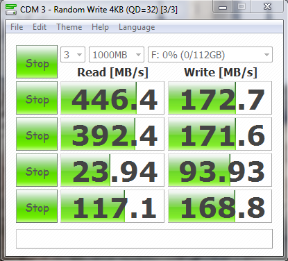 Crystal Disk Benchmark is used to measure read and write performance through sampling of highly compressible data (oFill/1Fill), or random data which is, for the most part, incompressible. In the V300, we have displayed testing using highly compressible data on the left, compared to that of incompressible on the right.