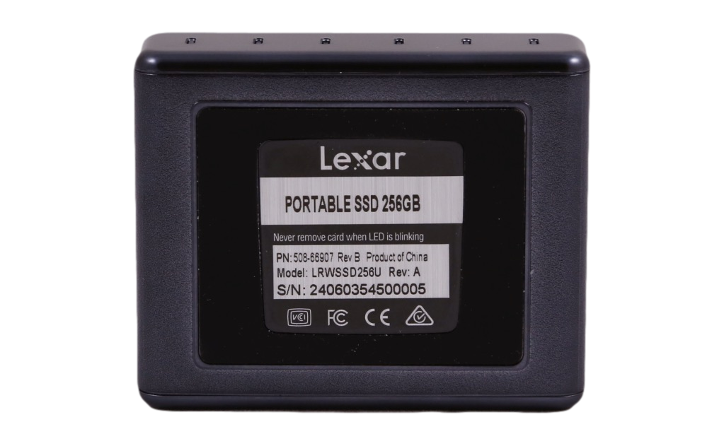 Taking a look at the front of the Lexar Portable SSD, you will see that there are six LED’s. Counting five from the left side, these white LED’s will let you know to what percentage your portable SSD’s capacity is at. The rightmost blue LED indicates the power.