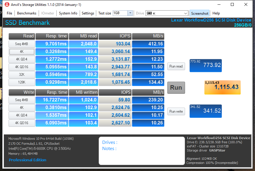 Anvil Storage Utilities is essentially an all-in-one tool for all of your SSD benchmarking needs. Anvil can be used for basic consumer testing, as well as endurance testing and threaded I/O read, write and mixed tests. It displays data regarding the SSD, and even about your system