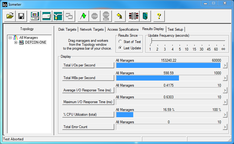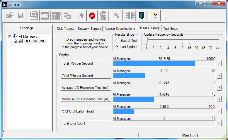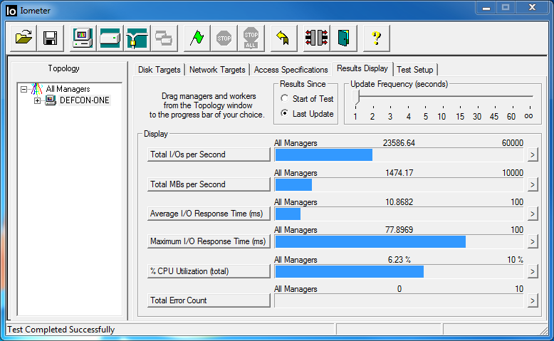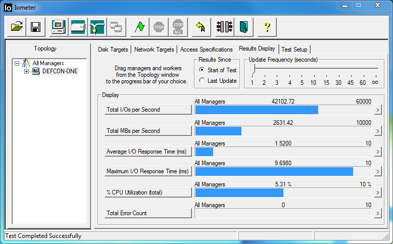 For the enthusiast crowd and enterprise, I have included IOMeter which allows for configurable cache sizes. We have set the test file to 8gb, so you can see the results without cache leverage. There are going to be a few screens displayed so your patience is appreciated as a few shots are just showing the massive amounts of IOPS that this system is capable of. In some cases, we had to use several workers to spread the load over the different cores of the processor due to Iometer limitations. 1 worker with the 4k random testing would only push results so high as we were reaching processor limitations.