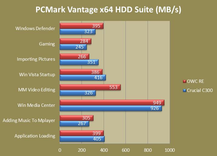 We were a bit surprised at the Vantage scoring of these drives as the OWCs actually pulled ahead a bit with a total HDD Suite point score of 87231 points compared to that of 80261 for the C300s. There is no getting around that these scores are absolutely amazing and show that there is performance difference in RAID configurations. Lets take a look at the chart and see how each fared compared to the other: