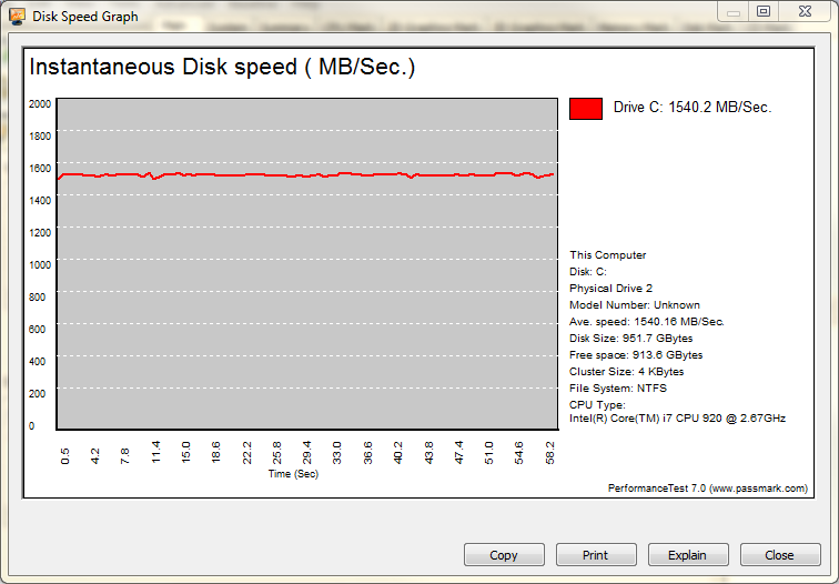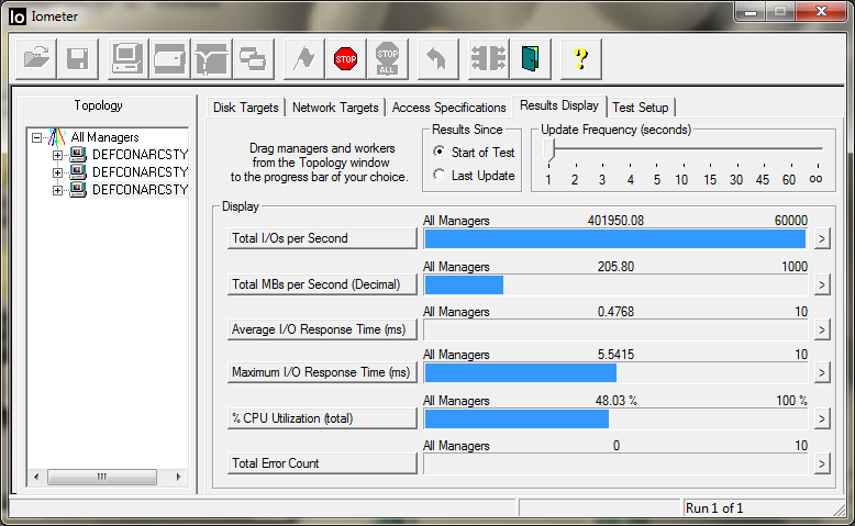In an all out effort to push maximum IOPS we loaded a 512b random workload 3 workers @ QD 128. The system spiked above 420,000 IOPS a few times but it was very difficult to capture a screenshot. This was a result of the limitation of our hardware under this extreme loading of my processor which was causing severe “choppiness”. I can confirm that it was a limitation of the hardware in use as server environments in enterprise applications use dual CPU systems. I am very curious as to how this would handle with a 6-core processor as a 990X would surely be able to get us up to the 460K IOPS. My highly overclocked 920 @ 4.65 was really struggling with this load!