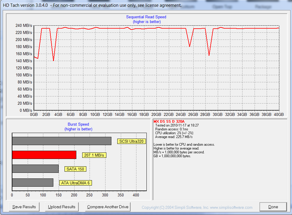Although HDTach is famous for pulling the numbers down a bit, its software provides us with a clear depiction of the stability of the solid state drive in the system. There are a few dips in the chart performance result but, for the most part, it is consistent which is great to see. In confirming a drives set up in ones system, this is an ideal method of determining whether there are software issues which may be affecting the performance of the SSD.
