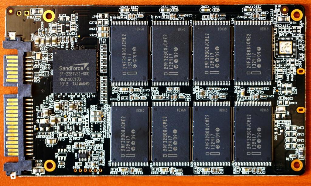 Each of the two daughter PCB’s contain the LSI SandForce SF-2281 flash storage processor and eight modules of Intel 32GB 25nm synchronous NAND flash memory, for a total size of 256GB per PCB which then becomes 512GB RAW capacity in the RAID 0 configuration. Once formatted, the total available storage volume is only 477GB.