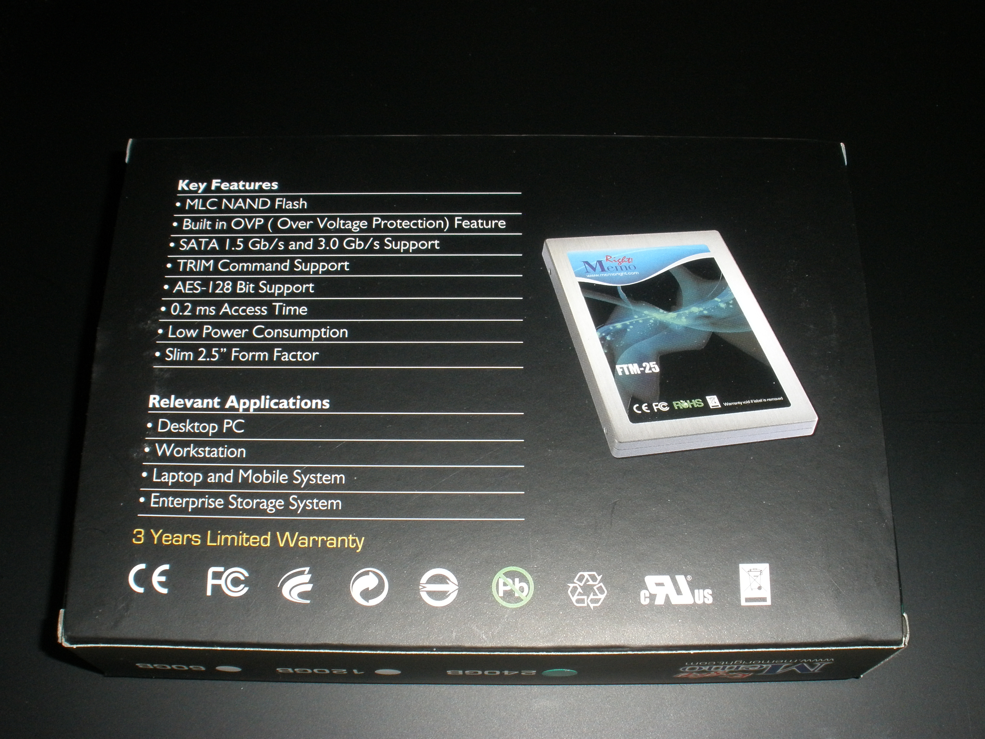 The exterior packaging is that of a compact cardboard box with the distinctive Memoright green and blue color scheme and description of its features on the back. We can see right off that this may become a retail release as relevant applications include that of desktop PCs and laptops.