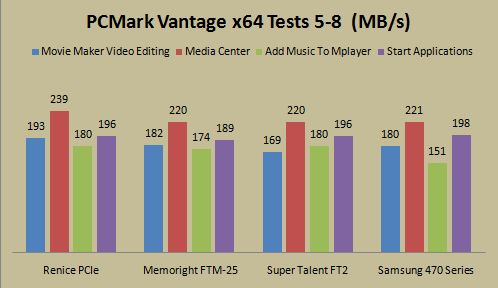 The SSD Review uses benchmark software called PCMark Vantage x64 HDD Suite to create testing scenarios that might be used in the typical user experience. There are eight tests in all and the tests performed record the speed of data movement in MB/s to which they are then given a numerical score after all of the tests are complete. The simulations are as follows: