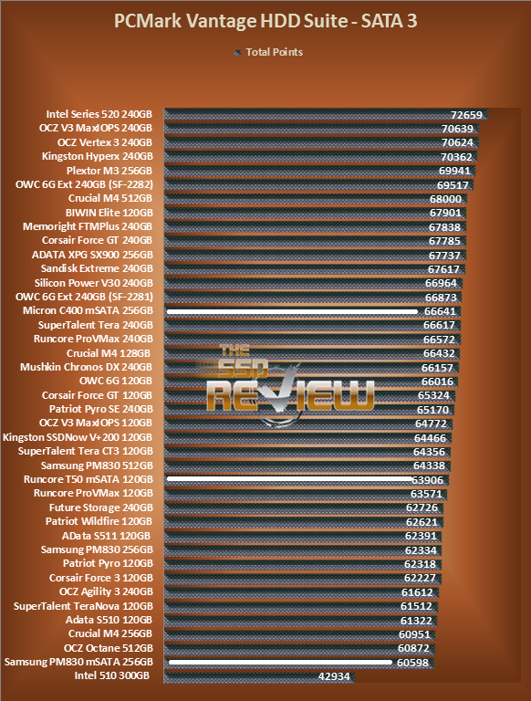 The Total Point Score for the Micron C400 was an unbelievable 66641 points which, not only blew away the other two SATA 3 SSDs in their category but also, placed the C400 amongst some of the top SSDs we have reviewed when looking at PCMark Vantage testing. The strength in the results display that the C400 was able to show consistently high transfer speeds in the majority of simulated tests, this being somewhat unusual as most SSDs will exceed standards in one or two of the tests at most.