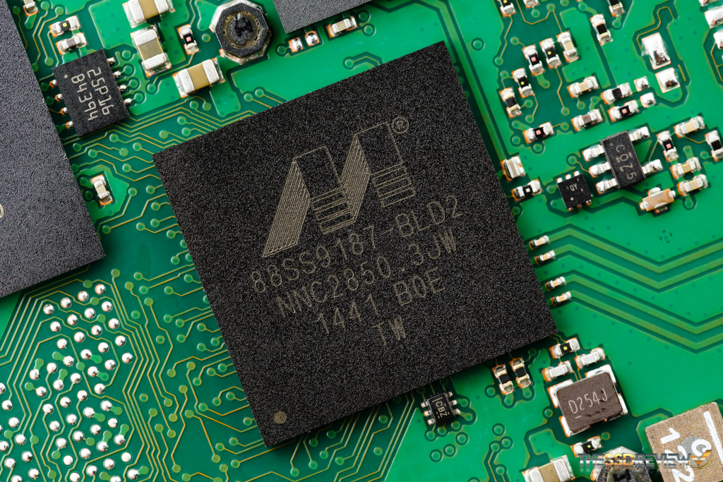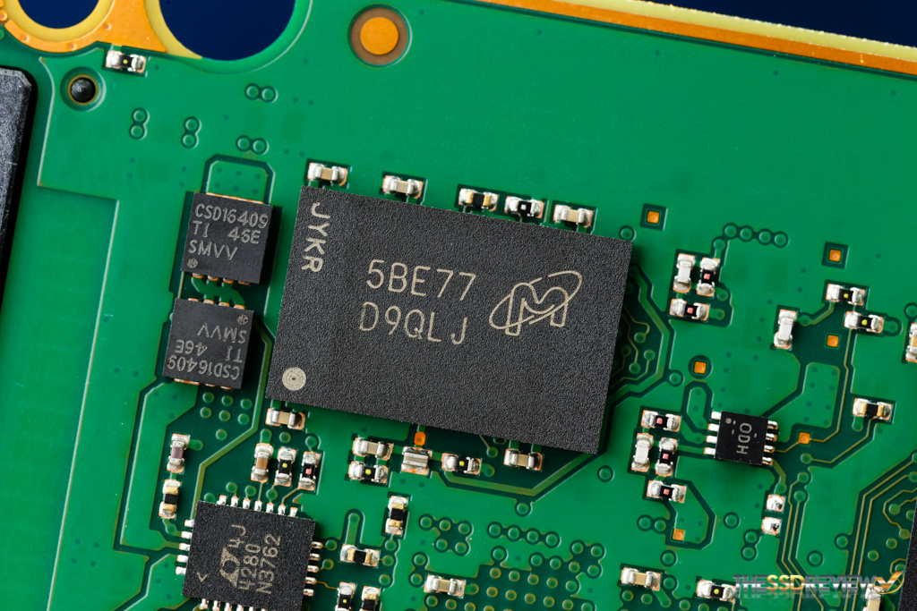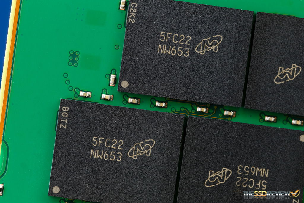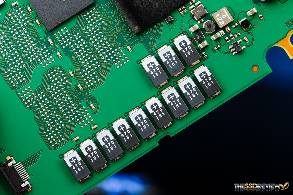 Overall, there is a single controller, five NAND packages, two DRAM packages and 13 capacitors.