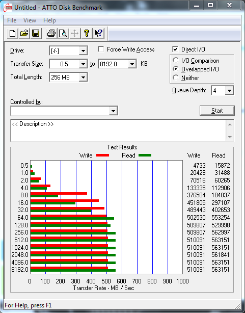 Initial results in ATTO show read speeds reaching 563MB/s and writes hitting 510MB/s.