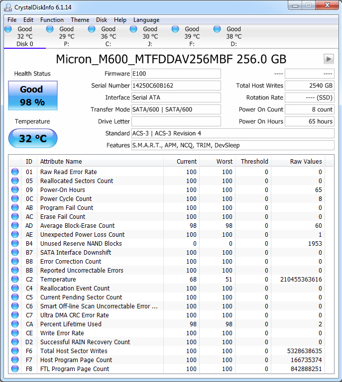 Crystal Disk Info is a great tool for displaying the characteristics and health of storage devices. It displays everything from temperatures, to the number of hours the device has been powered, and even to the extent of informing you of the firmware of the device.