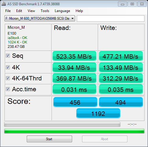 The toughest benchmark available for solid state drives is AS SSD as it relies solely on incompressible data samples when testing performance. For the most part, AS SSD tests can be considered the ‘worst case scenario’ in obtaining data transfer speeds and many enthusiasts like AS SSD for their needs. Transfer speeds are displayed on the left with IOPS results on the right.