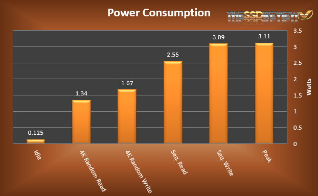The 256GB M.2 M600 is rated for a max power draw of 4.4W, an idle power draw of 100mW, and an active power draw of 150mW. As per our testing results, the drive was able to stay within their maximum power consumption range reaching a max of 3.11W. Idle power draw came in at 125mW, just about where it is supposed to be, even with the M.2 to SATA adapter in place.