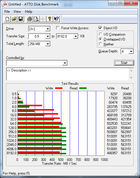 ATTO shows read and write speeds that follow a similar trend to the M.2 form factor. Read speeds reach 563MB/s and writes reach 510MB/s.