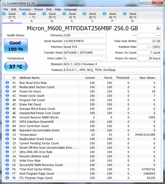 Crystal Disk Info is a great tool for displaying the characteristics and health of storage devices. It displays everything from temperatures, to the number of hours the device has been powered, and even to the extent of informing you of the firmware of the device.