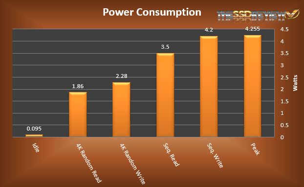 Idle power consumption is on point at 95mW, just 5mW under the 100mW rating. The drive is rated for a max power draw of 4.4W and based on out peak result, it was able to stay within spec. As a result of having two extra NAND packages over the M.2 2280 model, the power draw during sequential reads and writes are around 1 watt more.