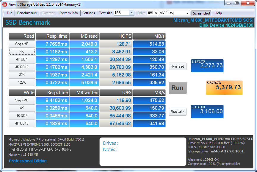 The 1TB M600’s overall score was 1049 with sequential speeds hitting 511MB/s reads and 478MB/s write. 4k speeds reached 32MB/s for read and 141MB/s for write.
