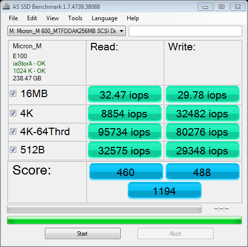 The toughest benchmark available for solid state drives is AS SSD as it relies solely on incompressible data samples when testing performance. For the most part, AS SSD tests can be considered the ‘worst case scenario’ in obtaining data transfer speeds and many enthusiasts like AS SSD for their needs. Transfer speeds are displayed on the left with IOPS results on the right.
