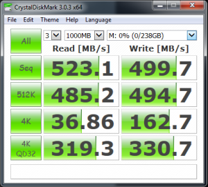 The 256GB drive reaches an overall score of 1194 with sequential speeds hitting 520MB/s reads and 477MB/s write. 4k speeds are also respectable with the 256GB drive reaching near 35MB/s for 4k read and 127MB/s 4k write.