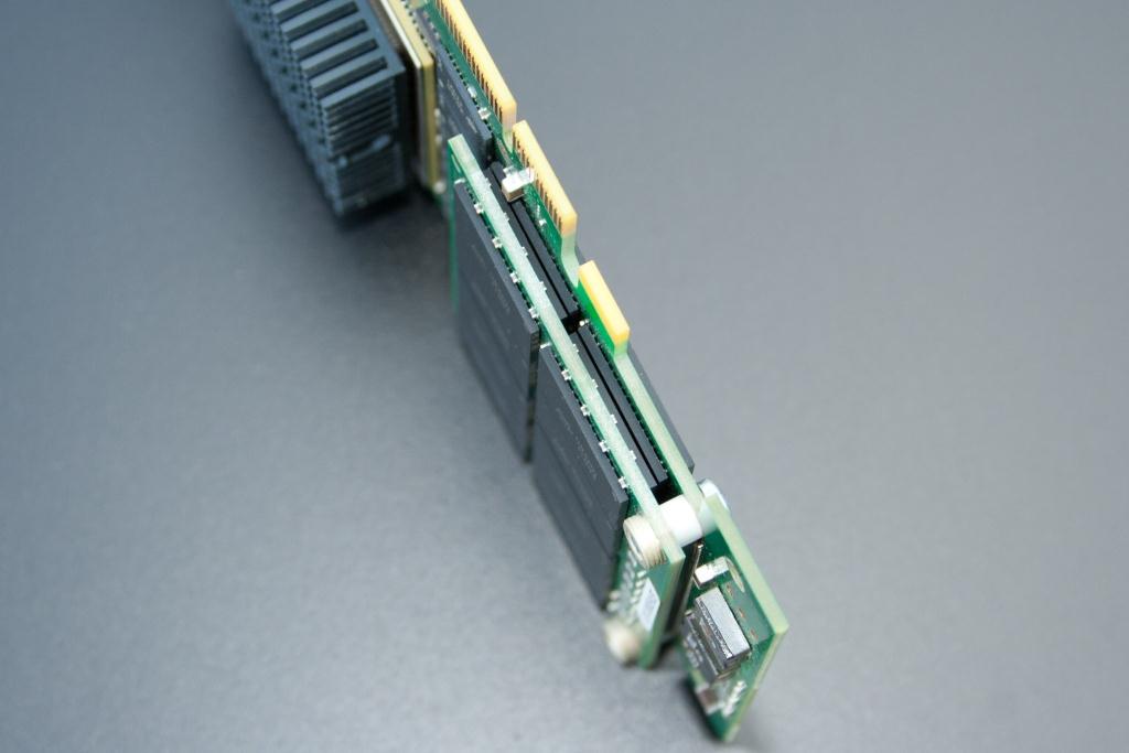 On the back, the remaining 16 pieces of the 64 NAND placements are located, with 4 more DDR3 modules. These are slightly different Micron ICs than the five front mounted.